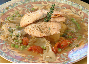Add peas. Taste for seasoning. Take off the heat and swirl in the cold butter. Serve over the salmon or place the salmon on mashed potatoes and serve the gravy around it.